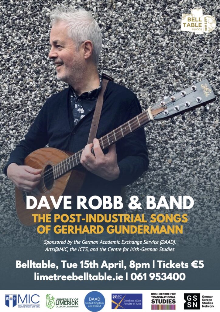 We are delighted to to invite you to an exciting afternoon and evening of intermedial, intercultural engagement in Limerick’s Belltable on April 15th 2025! As part of our ‘Promoting German Studies Networking Grant’ from the German Academic Exchange Service, acclaimed filmmaker Andreas Dresen will travel to Limerick for a screening of his film GUNDERMANN about East-German singer-songwriter and excavator operator Gerhard Gundermann. There will be a Q&A following the film with Andreas Dresen and singer/songwriter and Reader in Music DavidRobb (Queen’s, Belfast), who translated Gundermann’s songs into English. Dave and his band will perform their “Post-Industrial Songs of Gerhard Gundermann” in the Belltable that evening; Prof. Andreas Dresen will join the band for a couple of songs in German. Booking information below: Date: 15th of April 2025 Venue: Belltable, Limerick (69 O’Connell Street) FILM – GUNDERMANN: 2pm; the event is free, but you need to book your tickets here. CONCERT – Dave Robb & Band: Post-Industrial Songs of Gerhard Gundermann: 8pm. The concert will be free you, but please contact the event organiser, Christiane Schönfeld ([email protected]) or book your ticket here (5€).